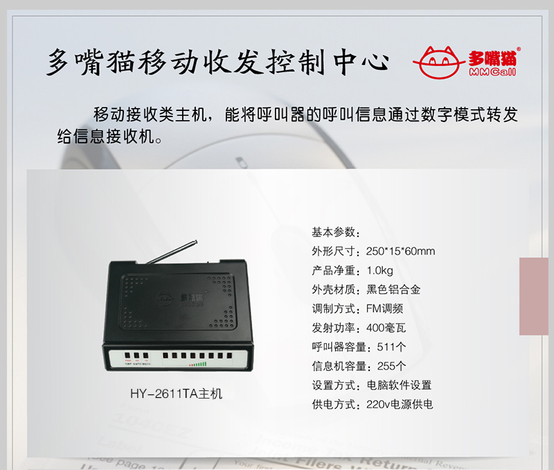 高性價(jià)比的移動(dòng)接收類主機(jī),能將呼叫器的呼叫信息通過數(shù)字模式轉(zhuǎn)發(fā)給信息接收機(jī)。可兼容多嘴貓全系列呼叫器。